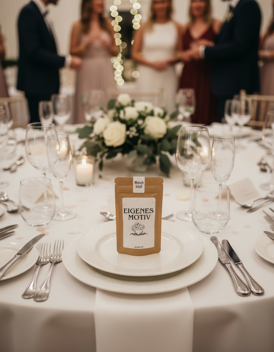 Jedes Tütchen lässt sich mit Ihrem individuellen Motiv, Namen oder Hochzeitsdatum gestalten und wird so zu einem einzigartigen Erinnerungsstück. Perfekt für eine elegante und durchdachte Gastgeschenk-Lösung, die Ihre Hochzeit widerspiegelt.
